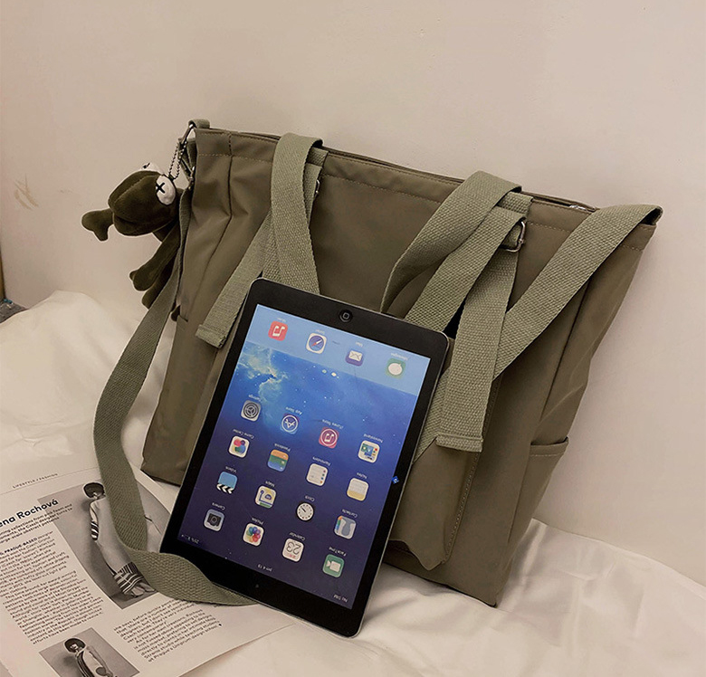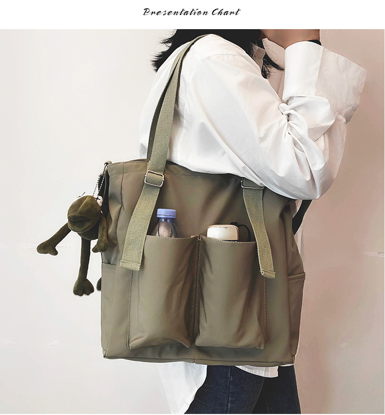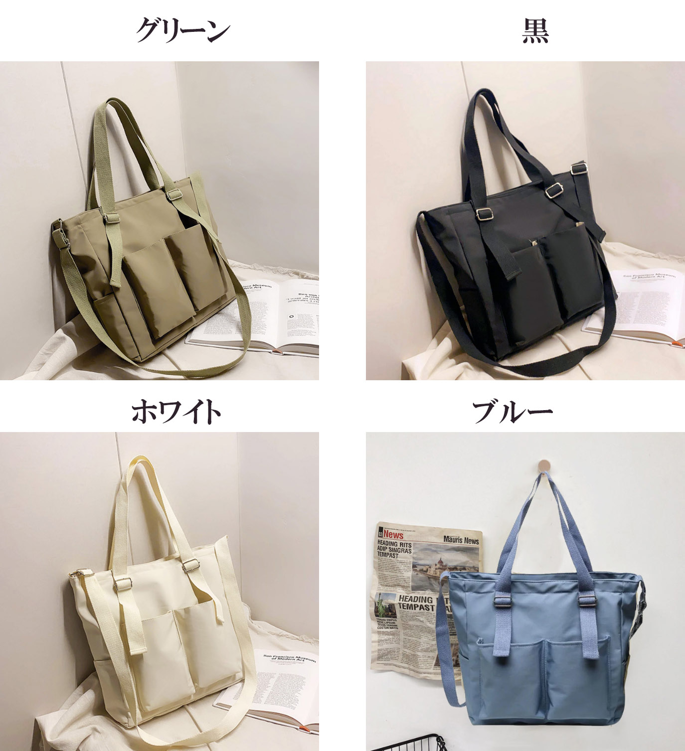 ■コメント ・たくさんポケット搭載されいるので綺麗に収納可能できる!トートバッグ。 ・旅行や出張などにおすすめの2wayキャリーオンバッグ。 ・大容量収納ができるトートバッグ。 ・収納力抜群!内部にもチャック付きポケット。 ・ストラップを付けて、斜め掛けやワンショルダーとして使っていただけます。 ・程よい大きさで通勤バッグやマザーバッグとしておすすめです。 ・オンオフにスタイリングを選ばず様々なシーンにお使いいただけます。 ・シンプルデザインなので、カジュアルでもきれいめでも合わせやすく、毎日でも使いたくなる愛されバッグです。 ■サイズ(約cm) 幅:約36cm / 高さ:約10cm / マチ:約34cm/肩紐:約120cm/重量:0.34kg ■カラー 画像に記載 ■素材 ナイロン ■裏地 なし ■内ポケット あり