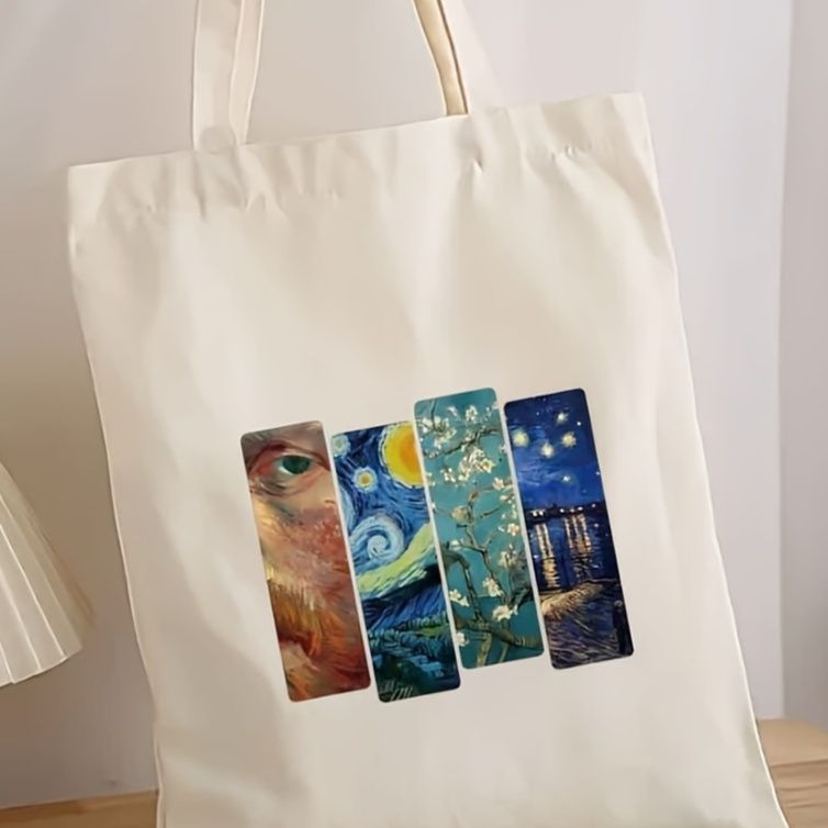 美術館の名作絵画を思わせる4枚のアートプリントが印象的な大きめのキャンバストートです。